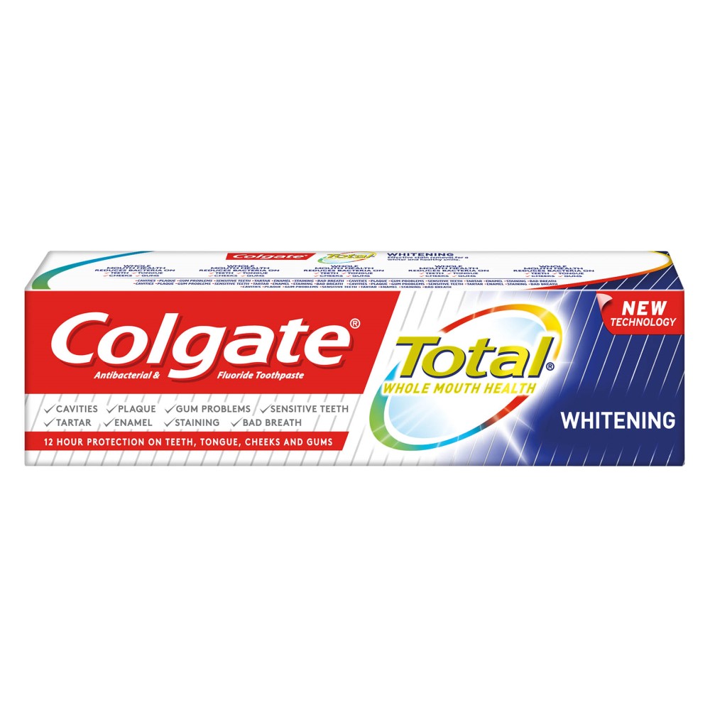 Η οδοντόκρεμα Colgate Total Whitening εξασφαλίζει την πλήρη φροντίδα για τα δόντια και τα ούλα σας. Καθαρίζει τα δόντια από την οδοντική πλάκα και τα υπολείμματα τροφών ενώ παράλληλα περιποιείται τα ούλα και το βλεννογόνο της στοματικής κοιλότητας.