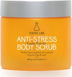 Το Youth Lab Anti-Stress Scrub Exotic Sunrise είναι ένα απολεπιστικό σώματος με φυσικούς κόκκους απολέπισης, σχεδιασμένο να απομακρύνει τα νεκρά κύτταρα, να ενυδατώνει και να αποτοξινώνει την επιδερμίδα, αφήνοντάς την λεία, απαλή και αρωματισμένη. Το εξωτικό του άρωμα “Exotic Sunrise” προσφέρει αίσθηση ευεξίας και χαλάρωσης, βοηθώντας στην αποσυμφόρηση του στρες.