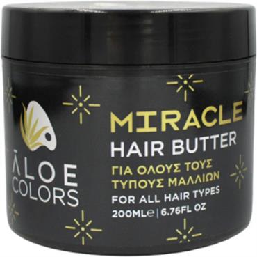 Aloe Colors Miracle Hair Butter 200ml. Πλούσιο ενυδατικό βούτυρο για λείανση, θρέψη και αναδόμηση όλων των τύπων μαλλιών, μειώνει φριζάρισμα και ψαλίδες.