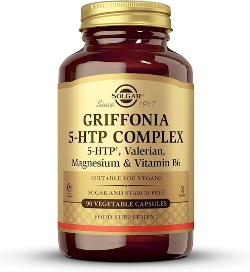 Solgar Griffonia 5-HTP Complex. Φόρμουλα για διάθεση, άγχος & ύπνο με 5-HTP, B6, μαγνήσιο & ρίζα βαλεριάνας. Φυσική υποστήριξη ευεξίας. 90 κάψουλες.