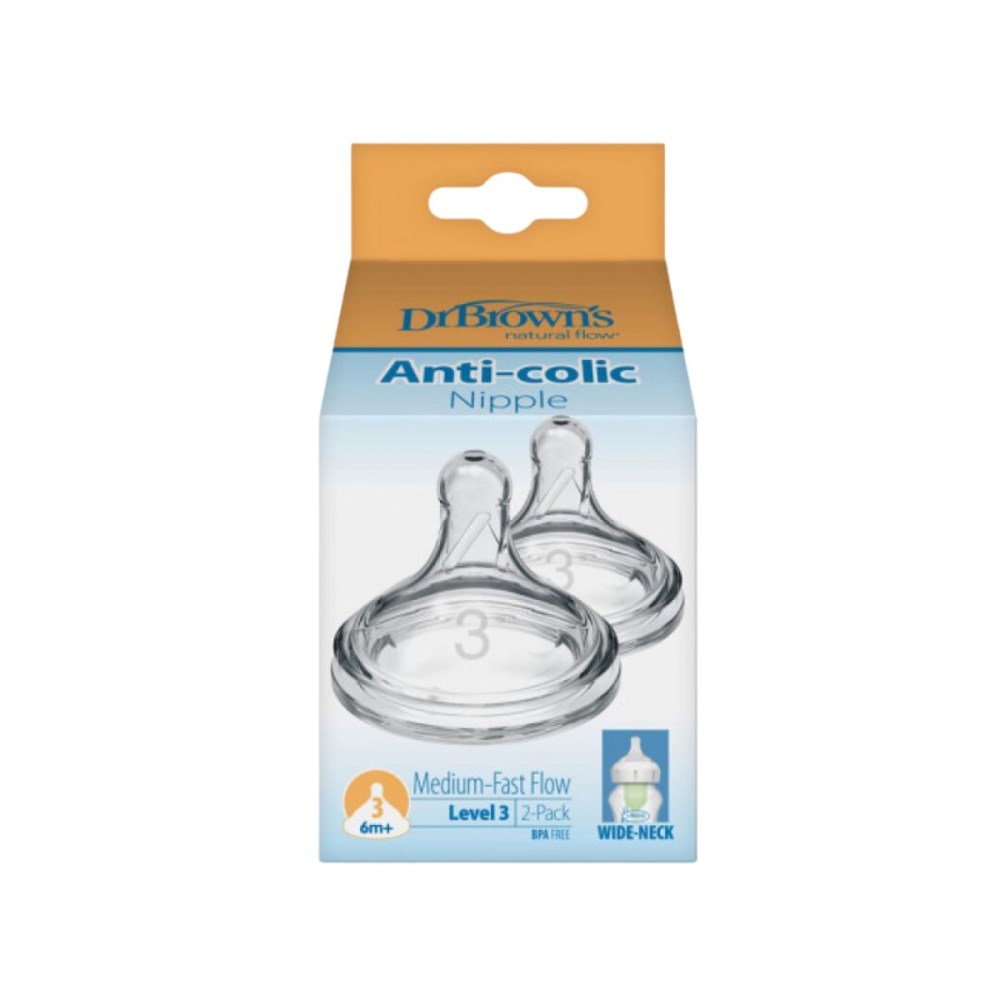 Η ροή τους είναι ιδανική για γάλα και πιο πηχτές τροφές, βοηθώντας στη μετάβαση του μωρού σε πιο γρήγορη ροή καθώς μεγαλώνει. Οι θηλές είναι συμβατές με τα περισσότερα μπιμπερό της Dr. Brown’s (Wide-Neck ή Narrow, ανάλογα με το μοντέλο) και υποστηρίζουν το αντικολικό σύστημα της μάρκας μειώνοντας την κατάποση αέρα.